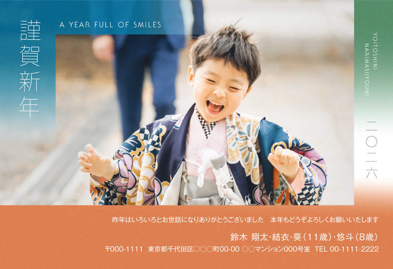主役の写真を大きく魅せつつ、染め物のようなフレームが年賀状らしい雰囲気を添えてくれる和モダン写真年賀状です。着物と色合わせをするように色展開をお楽しみください。