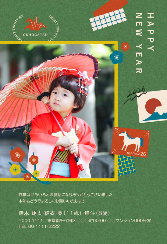 「思い出を貼り付けて、特別な一枚を」をテーマとした、切手をイメージしたデザインです。和モダンな風合いなので、着物のお写真との相性もバッチリです!
