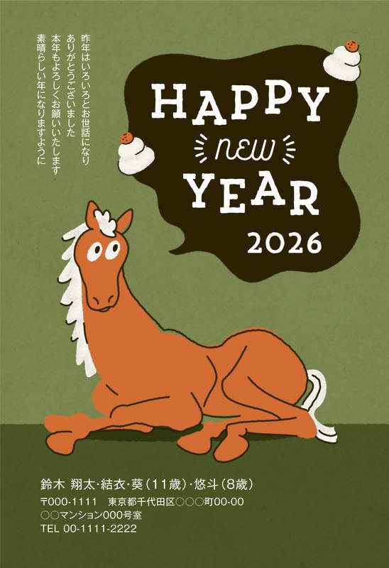 まるで海外の絵本の表紙のような、レトロな色合いのデザイン。干支の優しい表情が、暖かな新年の訪れを知らせてくれる年賀状です。