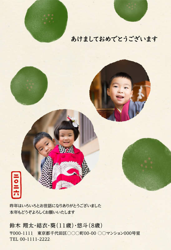 - 写真を独自の<エフェクト+自動合成>技術によりデザインの世界に溶け込ませることで、他の年賀状にはないアート表現を実現するデザインです。