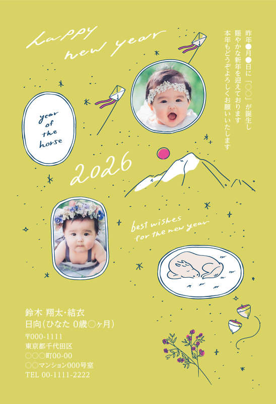 ナチュラルな世界観の中にお正月のモチーフをちりばめました。枠の中に写真が入ることで世界観とマッチした雰囲気を作ることができるデザインです。