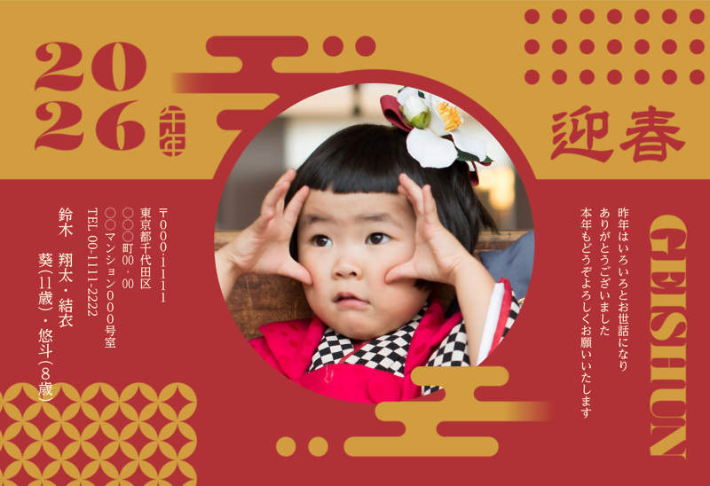 大きい椿のイラストが目を引く一枚。お正月らしい華やかさを表現しました。動きのある写真マスクもポイントです。