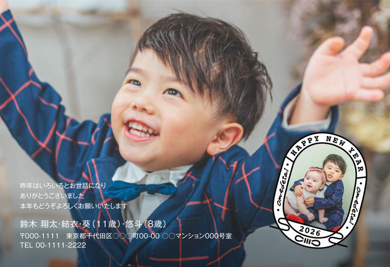 タイトルロゴと一緒になった写真マスクが新しい、全面に大きく写真を載せられるデザイン。ロゴはお正月らしく和風のあしらいを施しました。