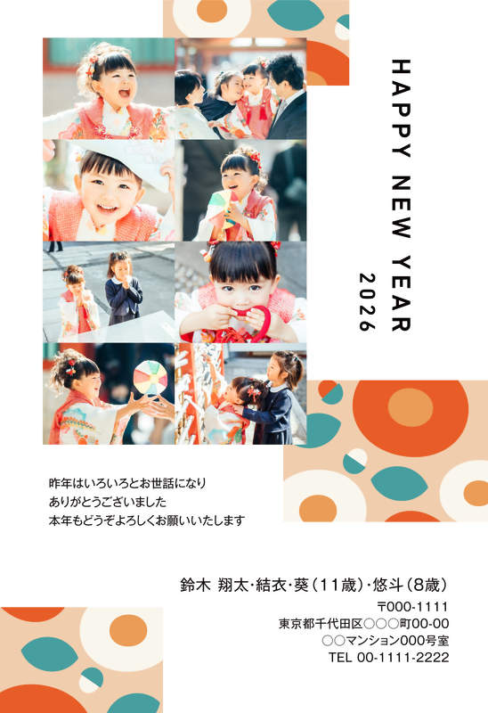 グラフィカルな椿の花をあしらったデザインは、和装との相性バッチリです。素敵な晴れの日のお写真で、新年のご挨拶はいかがでしょうか。