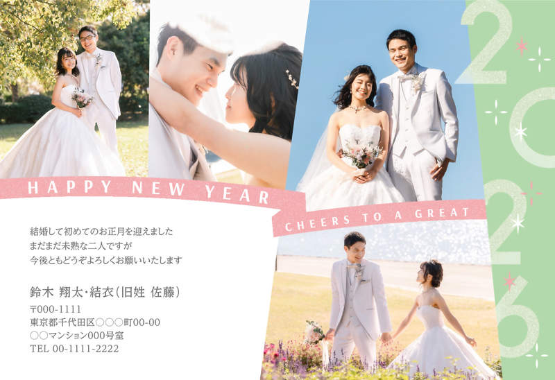 一富士、二鷹、三茄子…これぞ定番年賀状!たくさん良いことが訪れますように…そんな願いを込めました。笑顔の写真を入れてより福を呼び込みましょう。