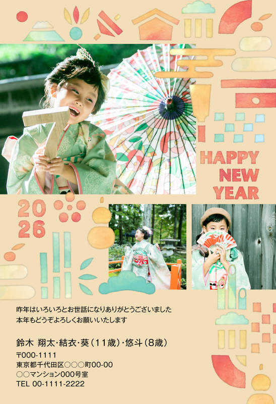 一見直線的ですが、水彩で描かれた定番お正月モチーフのイラストが優しい印象を与えます。年賀状らしさとおしゃれさを両立させた、使いやすいデザインになっています。
