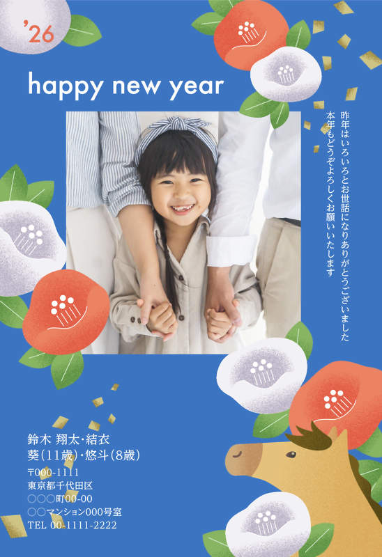 椿や干支、ふわりと舞う金箔…お正月らしいモチーフをちりばめつつ爽やかな色合いでまとめられたオシャレな一枚。数ある年賀状の中でも目を引くことは間違いなしです。