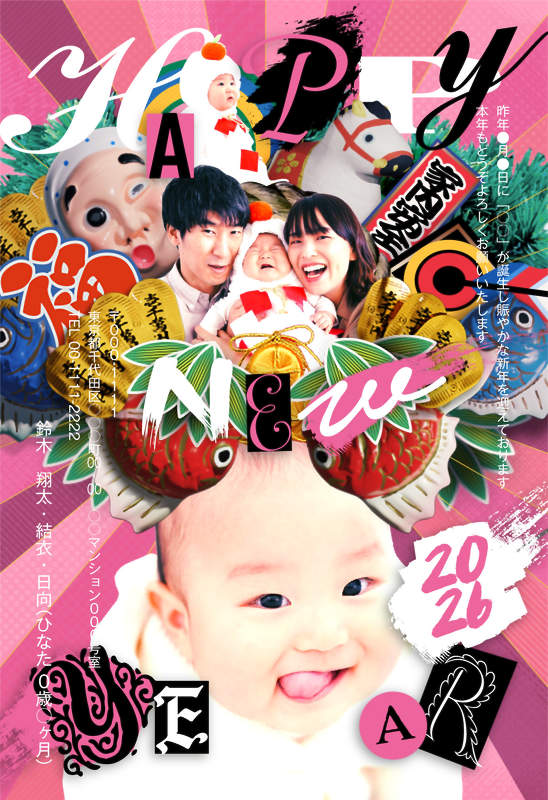 写真を独自の<エフェクト+自動合成>技術によりデザインの世界に溶け込ませることで、他の年賀状にはないアート表現を実現するデザインです。