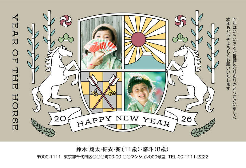 エンブレムをメインにスタイリッシュに構成されたデザイン。よく見ると松、竹、梅、日の丸…とお正月らしさが盛り沢山。センスの良さをアピールしたい方におすすめです。
