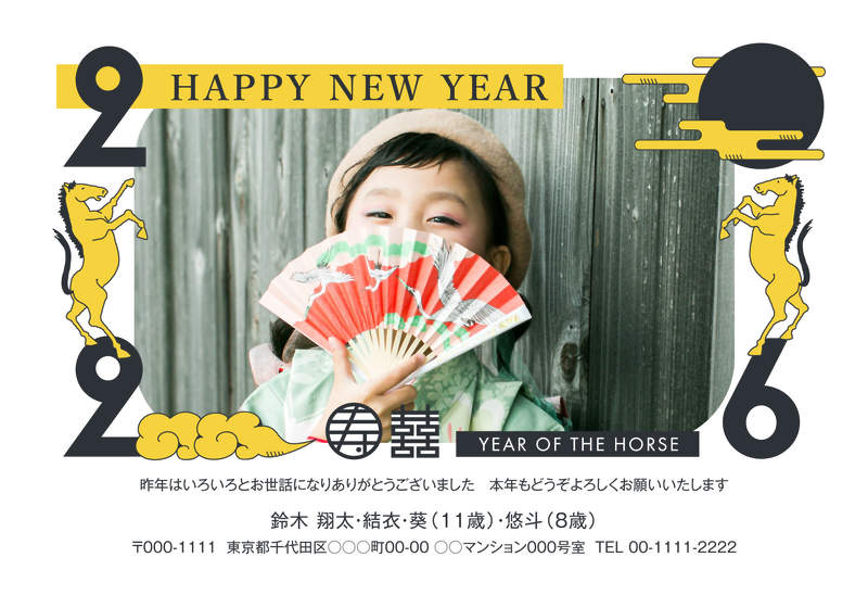 日本と中華圏のお正月の縁起物である「寿」と「双喜紋」を取り入れた、和漢折衷テイスト。シックな色合いが、抑えた色合いの写真にマッチするおしゃれな年賀状です。