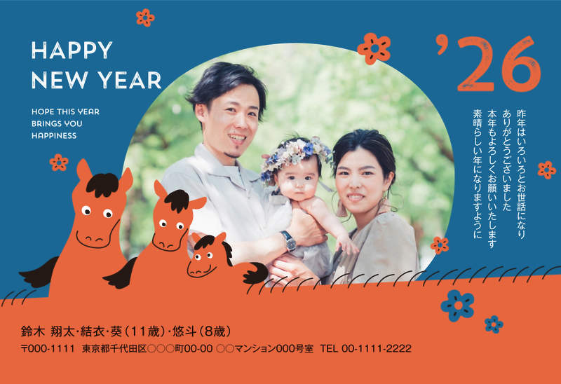 仲睦まじい干支の親子のように、寄り添う家族写真がぴったりハマるデザイン。皆で顔を寄せ合い元気いっぱいの姿を届けるもよし、我が子の可愛い笑顔も届けられる一枚です。