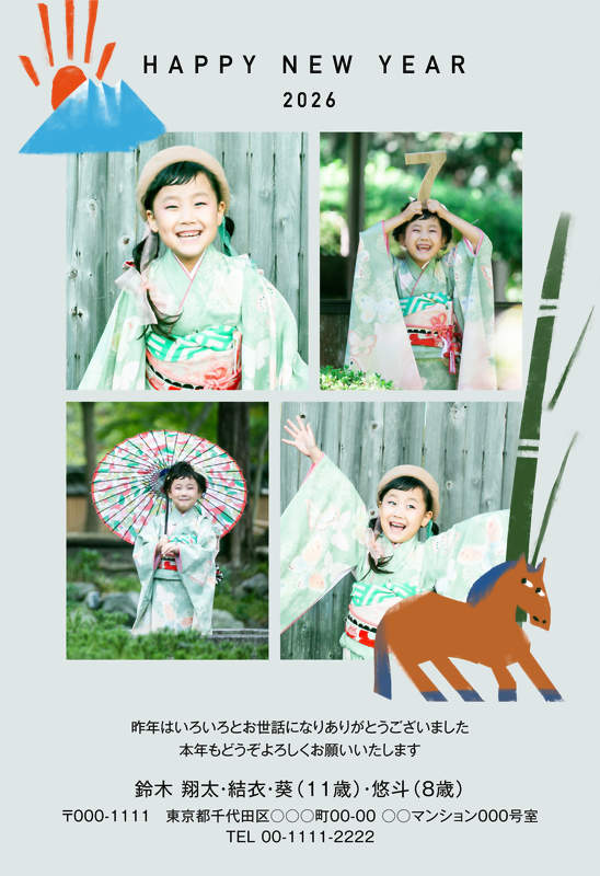 縁起物をカジュアルにまとめたデザインです。お写真枚数の種類もあるので、お気に入りの一枚から、日々の笑顔を切り取ったスマホ写真まで用途に応じてお使い頂けます。