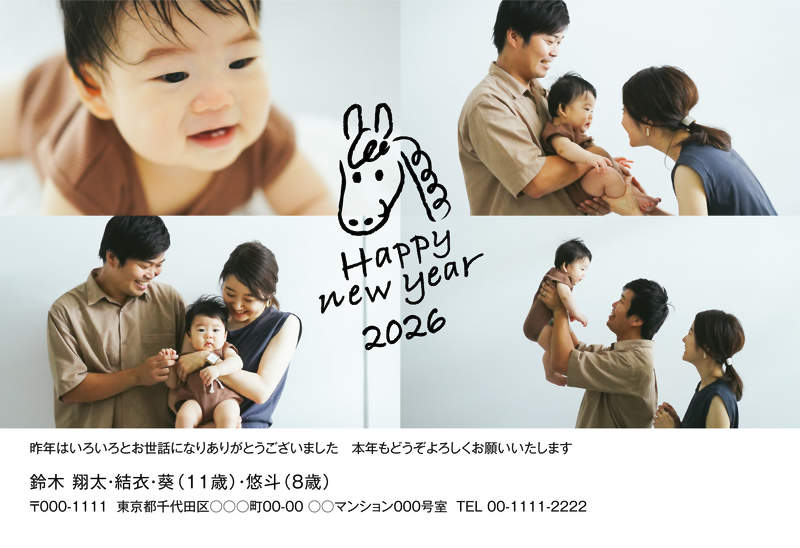 ニッコリスマイルの干支イラストと年賀のご挨拶がワンポイントで入る全面写真デザインです。家族の幸せな時間をとらえた写真にぜひ合わせてみてくださいね。