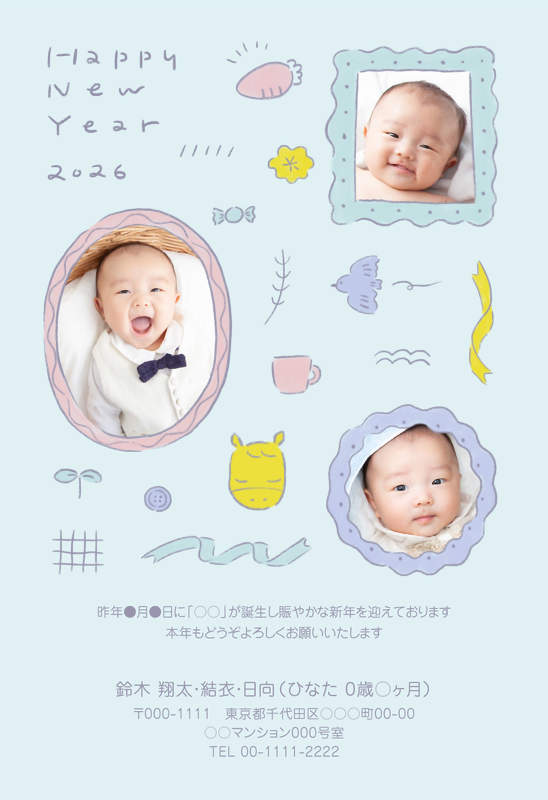 ナチュラルな水彩風モチーフをちりばめました。淡く優しいデザインには赤ちゃんのお写真がオススメです。額縁に、とっておきの一枚をいかがでしょうか。