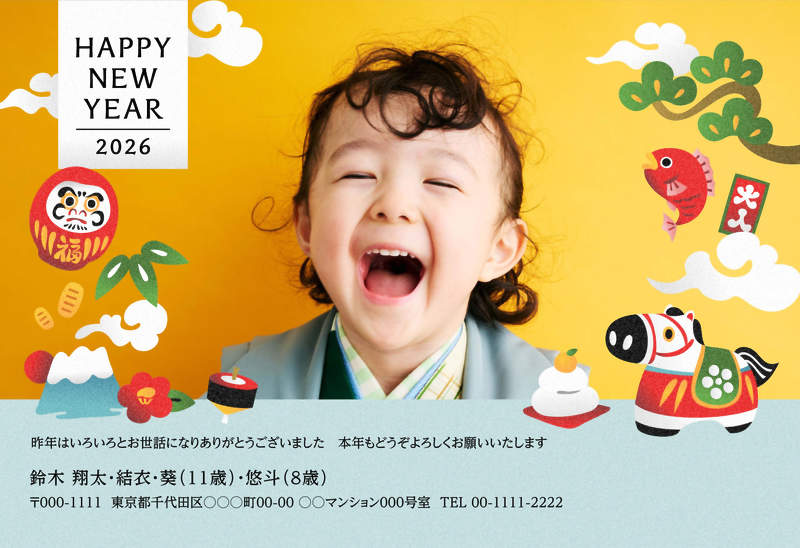 写真枠を大胆に使った、定番縁起物モチーフが彩りを添えてくれる一品。2・3枚パターンではメイン枠に今年とっておきの1枚、サブには遊び心ある1枚で楽しげな年賀状に。