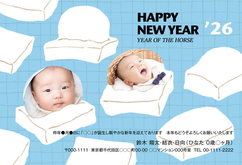 ふっくら膨らんだお餅が並ぶ、優しいながらも印象に残るデザインです。赤ちゃんや小さなお子様の写真はお餅の柔らかさと相性バッチリ!顔のアップがおすすめです!