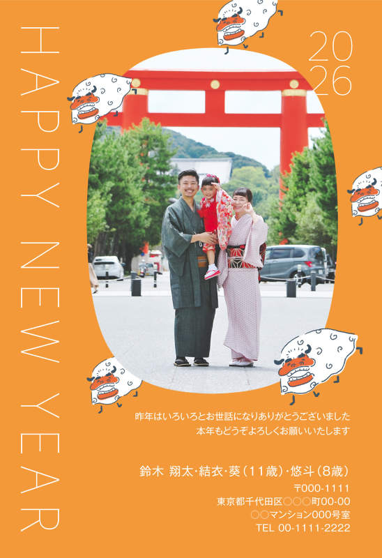 獅子舞の大群...の中に1匹だけどこか違うような...?シンプルながらどこかクスッとしてしまうこちらのデザインには笑顔の家族写真がよく合います。