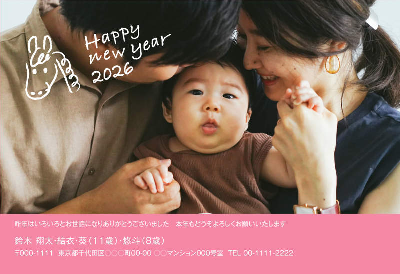 ニッコリスマイルの干支イラストと年賀のご挨拶がワンポイントで入る全面写真デザインです。家族の幸せな時間をとらえた写真にぜひ合わせてみてくださいね。