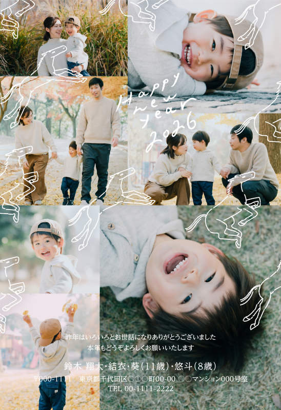 温もりある手書きの線で描かれた干支と賀詞がナチュラル&カジュアルな年賀状。最大9枚の写真が入り「写真を大きく」も「写真をたくさん」も叶える全面写真デザインです。