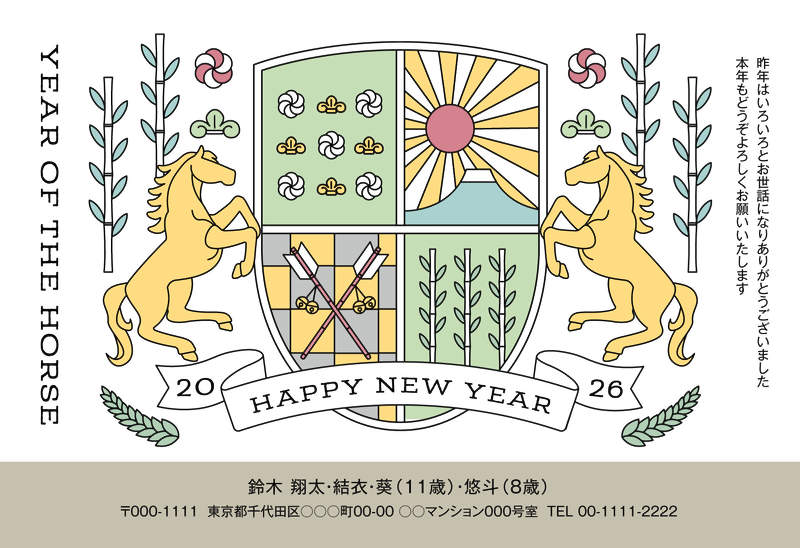 エンブレムをメインにスタイリッシュに構成されたデザイン。よく見ると松、竹、梅、日の丸…とお正月らしさが盛り沢山。センスの良さをアピールしたい方におすすめです。