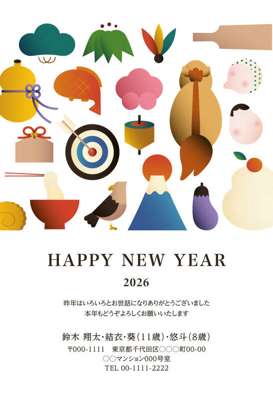 鏡餅や松竹梅、おかめや富士山などのお正月モチーフをグラフィックにして散りばめました。やわらかくも少しかしこまった雰囲気で、ファミリーにもビジネスにも◎。