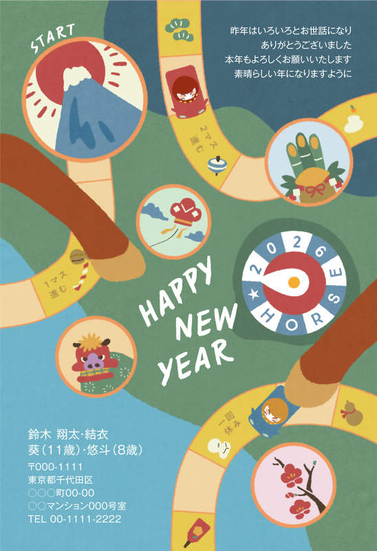 色とりどりの正月モチーフが散りばめられたすごろく風デザインは、その楽しげな雰囲気に笑顔になること間違いなし。写真を入れないイラストのみVerもおすすめです。