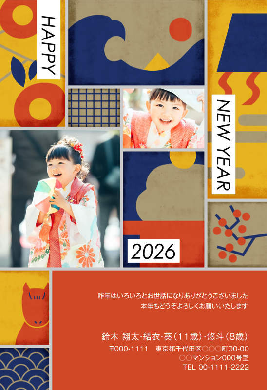グラフィカルな年賀モチーフが並ぶ様はまるで美術館?デザインの中に組み込まれた写真マスクには、どんな写真を入れてもかっこよくハマります。