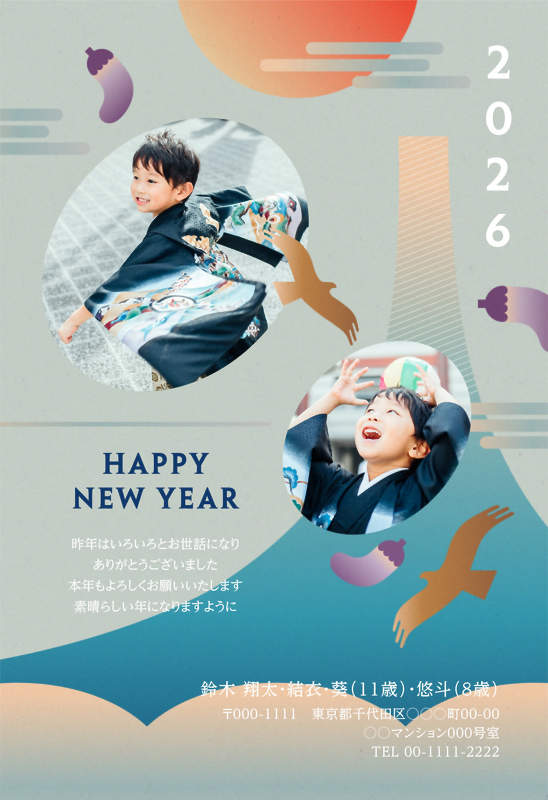 お正月といえば「一富士二鷹三茄子」で、縁起よく新年のご挨拶!定番さは欲しいけど、他とは違うおしゃれさが欲しいという方はぜひトライしていただきたいデザインです。