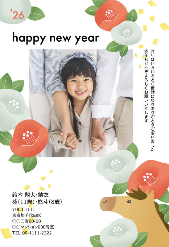 椿や干支、ふわりと舞う金箔…お正月らしいモチーフをちりばめつつ爽やかな色合いでまとめられたオシャレな一枚。数ある年賀状の中でも目を引くことは間違いなしです。