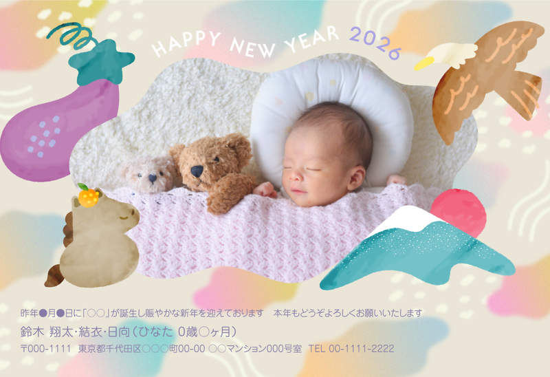 テーマは初夢!一富士・二鷹・三茄子…に、干支をよくみると?王道なモチーフをドリーミーな世界観で、お子様やペットの寝顔を入れるのがおすすめです◎。
