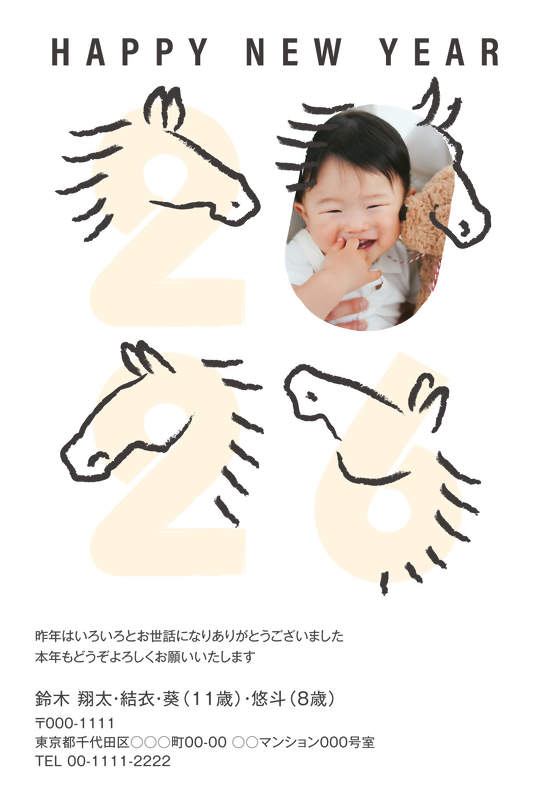 年号の数字をメインビジュアルに据えた、シンプルながらもポイントに遊びを効かせたデザイン。柔らかくポップな色合いで、お子様の写真との相性バッチリです。