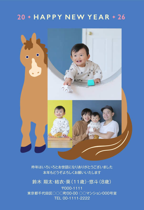 干支が家族みんなを包み込んでくれるほっこりゆるいデザインです。バリエーションで変わる雰囲気も、選ぶのが楽しくなるよう設計。イラストをより楽しむなら写真なしでも◎