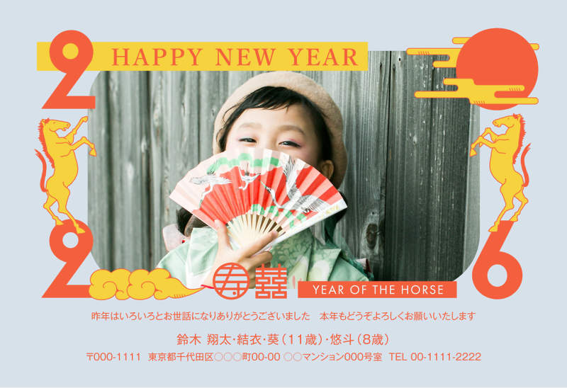日本と中華圏のお正月の縁起物である「寿」と「双喜紋」を取り入れた、和漢折衷テイスト。シックな色合いが、抑えた色合いの写真にマッチするおしゃれな年賀状です。