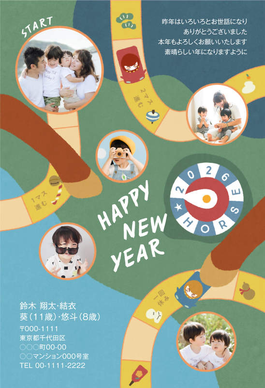 色とりどりの正月モチーフが散りばめられたすごろく風デザインは、その楽しげな雰囲気に笑顔になること間違いなし。写真を入れないイラストのみVerもおすすめです。