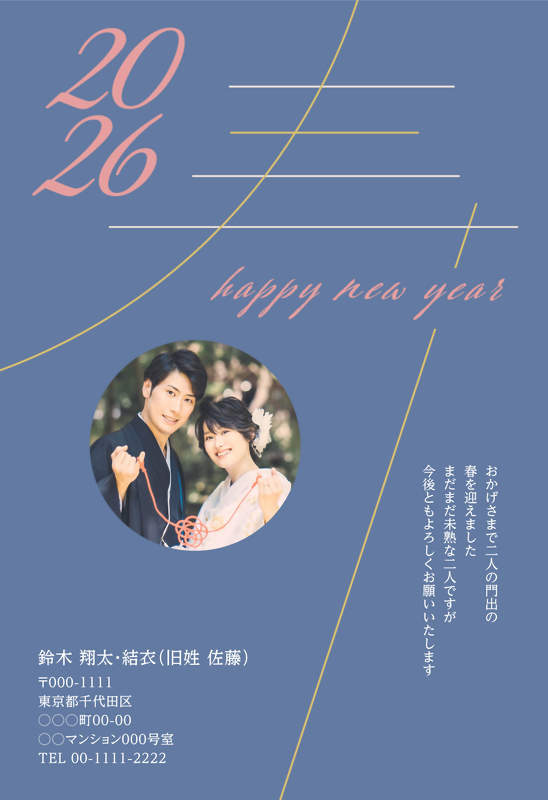伝統的なカラーの上に、繊細なラインで描かれた「寿」と筆記体の組み合わせがモダンな一枚。写真なしバリエーションでもお使いいただける、洗練された大人向けの一枚です。