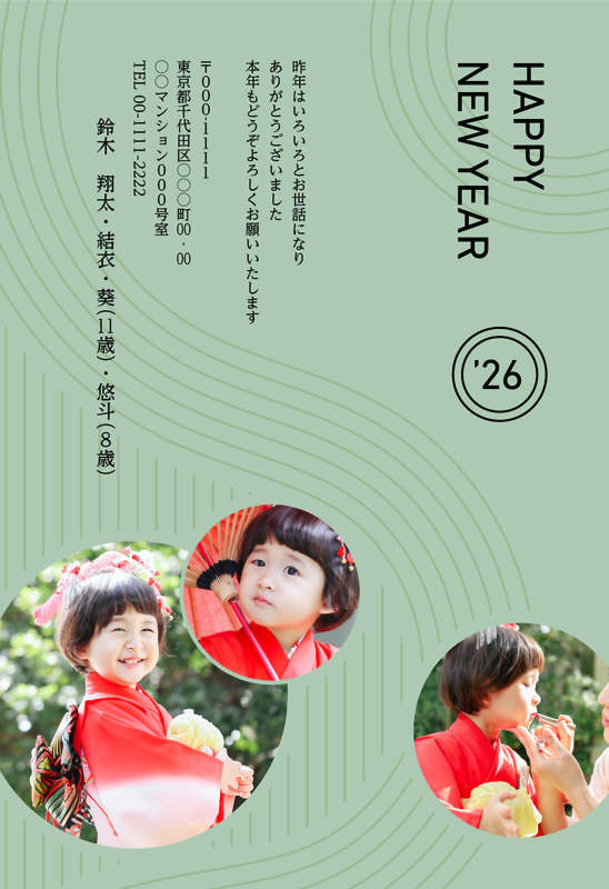 枯山水をイメージしたデザインです。最低限の流線の装飾が写真を引き立てます。色鮮やかな写真を入れると、コントラストが美しい年賀状に仕上がります。