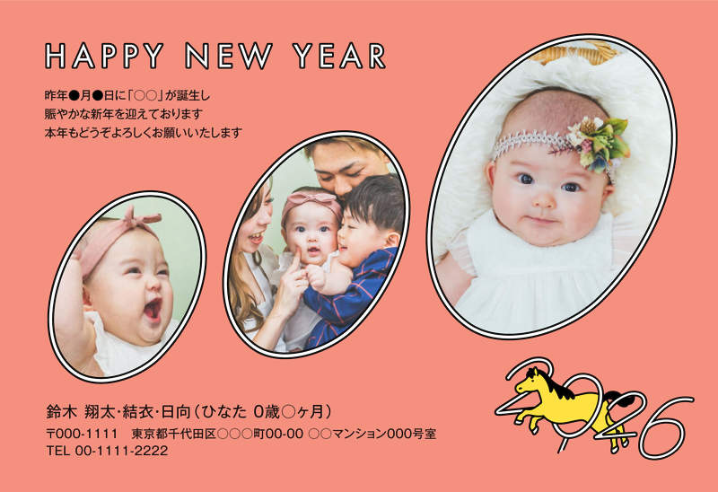 今年の年号の輪っかを干支がくぐり抜けているイラストがポイント。シンプルながらもユニークなデザインです
