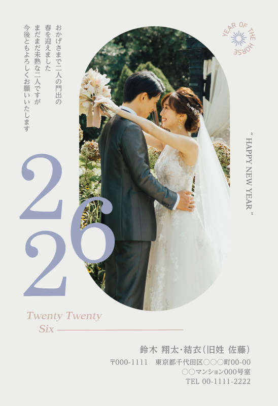 シンプルさの中にも年号の並びが印象的な一枚は、品よく写真を引き立てます。ニュアンスカラーを取り入れた上品な色展開で、結婚報告におすすめのデザインです。