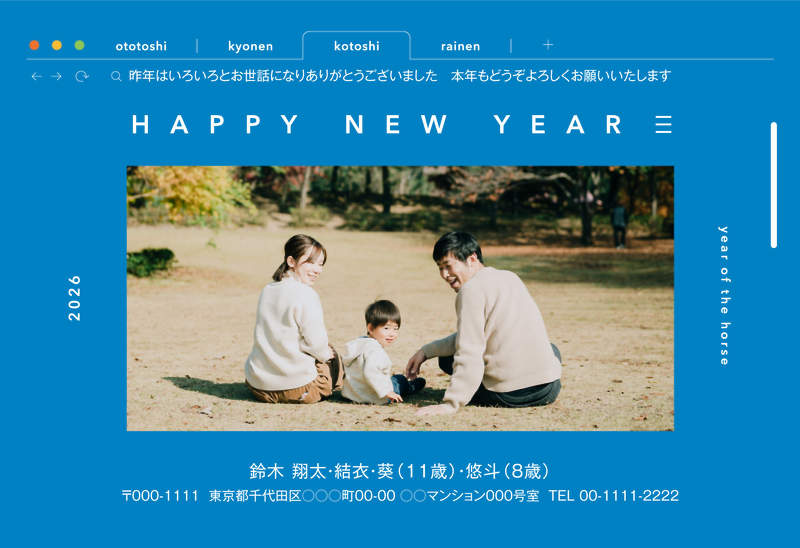 ウェブブラウザをモチーフにした、シンプル且つ遊び心のあるデザインです。大切な人との素敵な一枚を「kotoshi」のトップにいかがでしょうか。