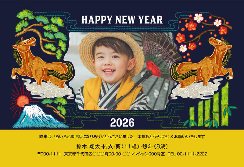 スカジャンを彷彿とさせる刺繍風デザインです。手作りの優しげな雰囲気も兼ね備えているため、和装の写真はもちろん、お子様の日常写真にもぴったりです。