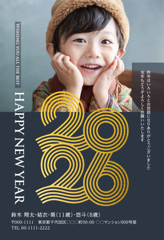 - 箔押しの定番ともいえる金箔加工は、ハレのご挨拶にぴったり。豪華な輝きと重厚感はそのままに、年賀家族ならではの写真を引き立てるスタイリッシュなデザインをご用意いたしました。