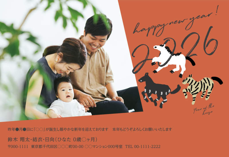 筆で書いたようなストライプ柄がお写真をカッコいい印象に仕上げてくれます。キメの写真を入れて印象に残るクールな年賀状に。