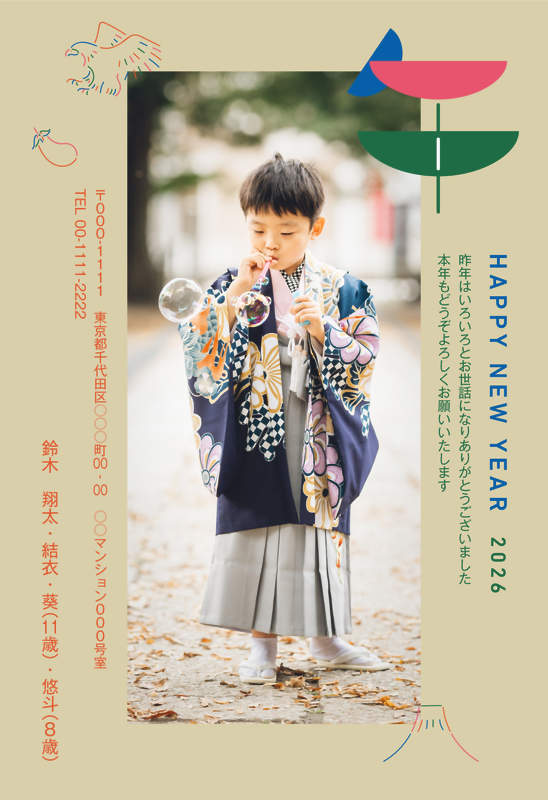 さりげない「一富士二鷹三茄子」に干支の文字が目を引くこちらのデザインは、和装のお写真にピッタリです。ぜひお気に入りのバリエーションを見つけてみてください。