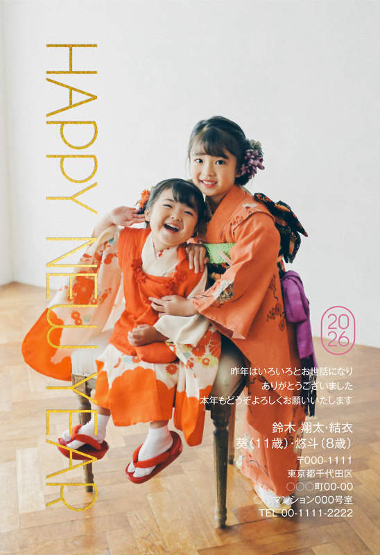- 箔押しの定番ともいえる金箔加工は、ハレのご挨拶にぴったり。豪華な輝きと重厚感はそのままに、年賀家族ならではの写真を引き立てるスタイリッシュなデザインをご用意いたしました。
