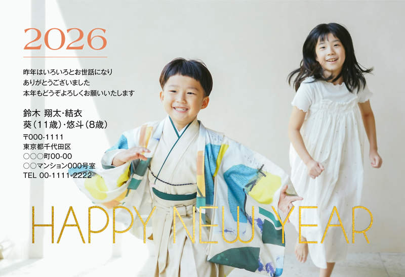 - 箔押しの定番ともいえる金箔加工は、ハレのご挨拶にぴったり。豪華な輝きと重厚感はそのままに、年賀家族ならではの写真を引き立てるスタイリッシュなデザインをご用意いたしました。