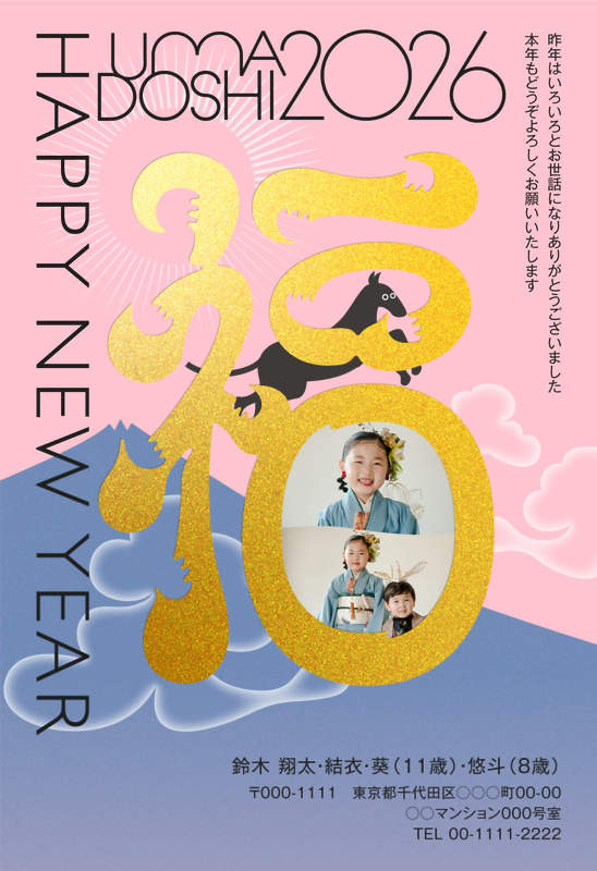 - 箔押しの定番ともいえる金箔加工は、ハレのご挨拶にぴったり。豪華な輝きと重厚感はそのままに、年賀家族ならではの写真を引き立てるスタイリッシュなデザインをご用意いたしました。